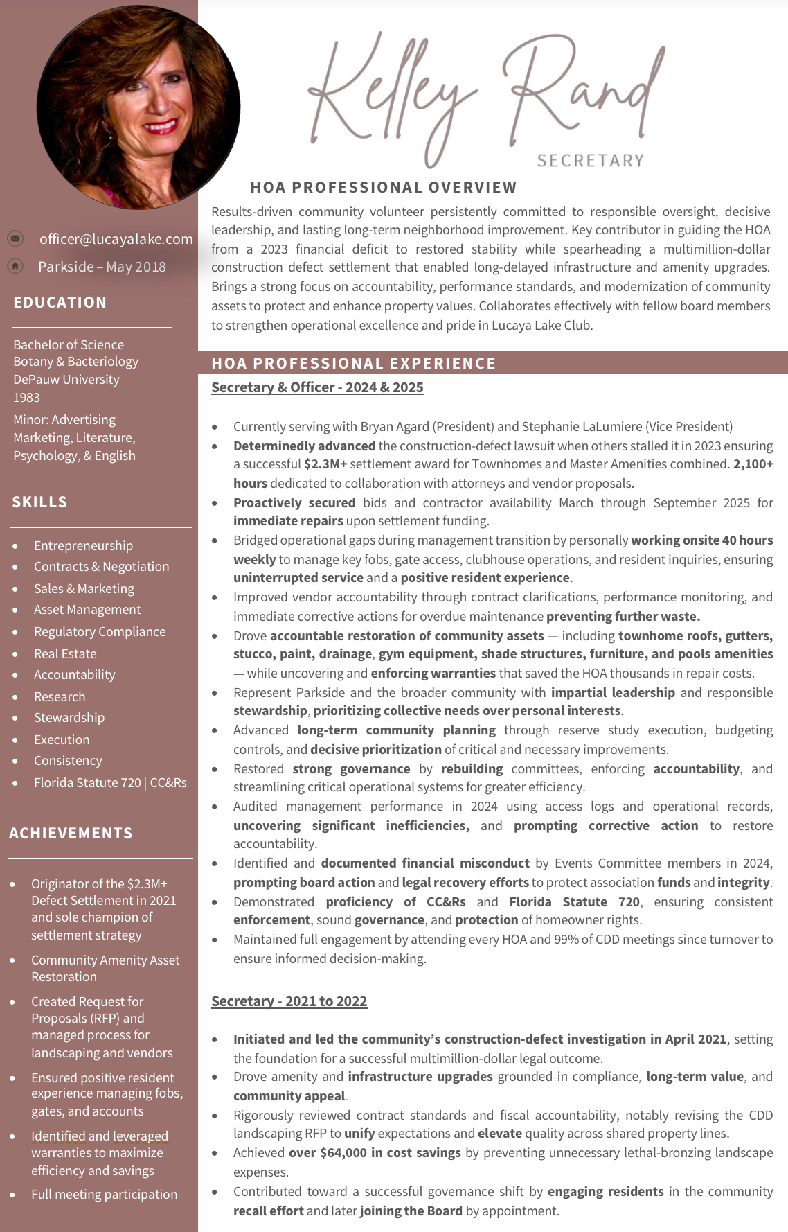 Results-driven community volunteer persistently committed to responsible oversight, decisive leadership, and lasting long-term neighborhood improvement. Key contributor in guiding the HOA from a 2023 financial deficit to restored stability while spearheading a multimillion-dollar construction defect settlement that enabled long-delayed infrastructure and amenity upgrades. Brings a strong focus on accountability, performance standards, and modernization of community assets to protect and enhance property values. Collaborates effectively with fellow board members to strengthen operational excellence and pride in Lucaya Lake Club